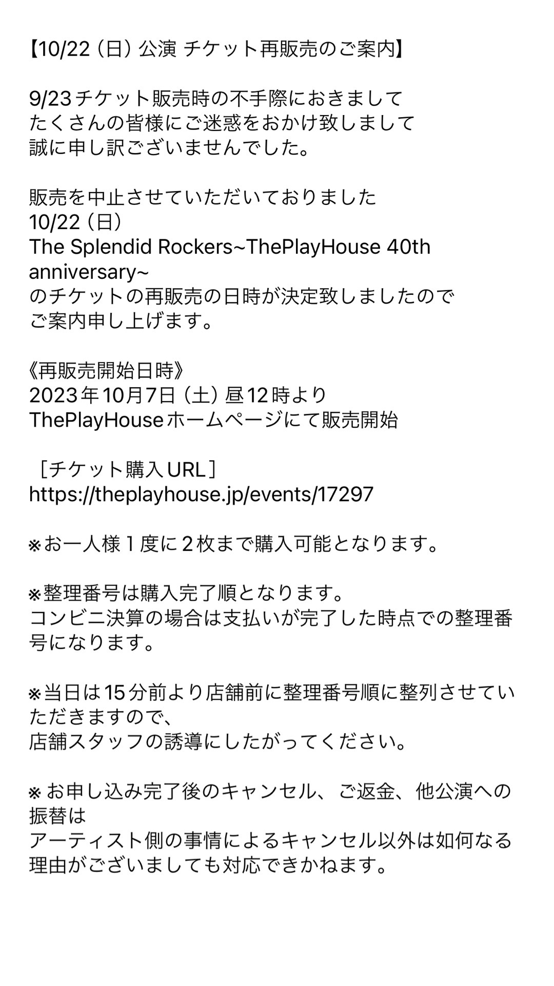 【10/22公演チケット販売における不備へのお詫びと今後の対応について】
